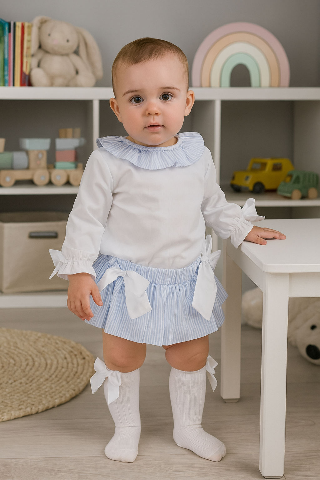 Blusa com gola + tapa fralda com pormenores dos laços laterais e dos folhos.