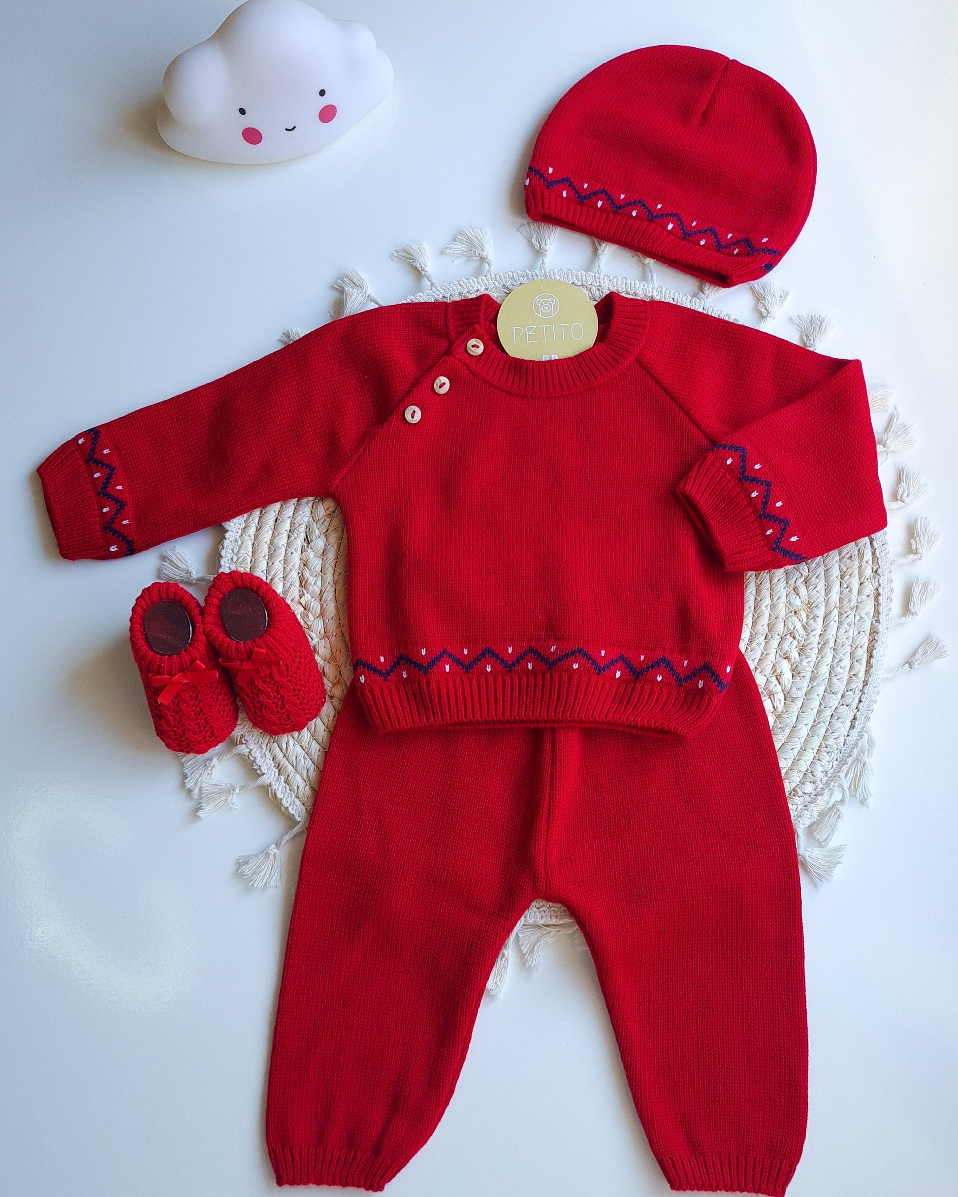 Conjunto composto por camisola, calças e gorro — tudo em malha super confortável e quentinha para o seu bebé.