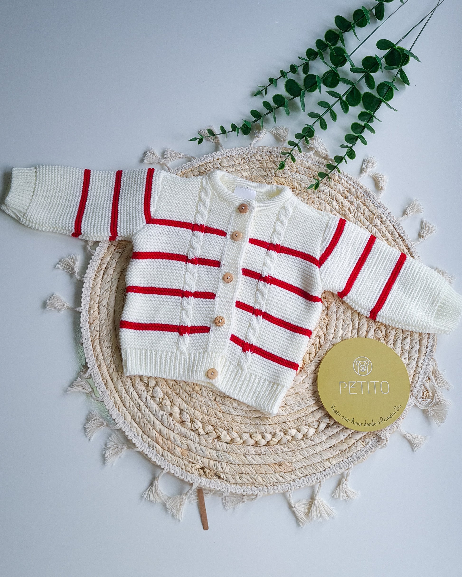 Casaco de malha pérola com riscas vermelhas.