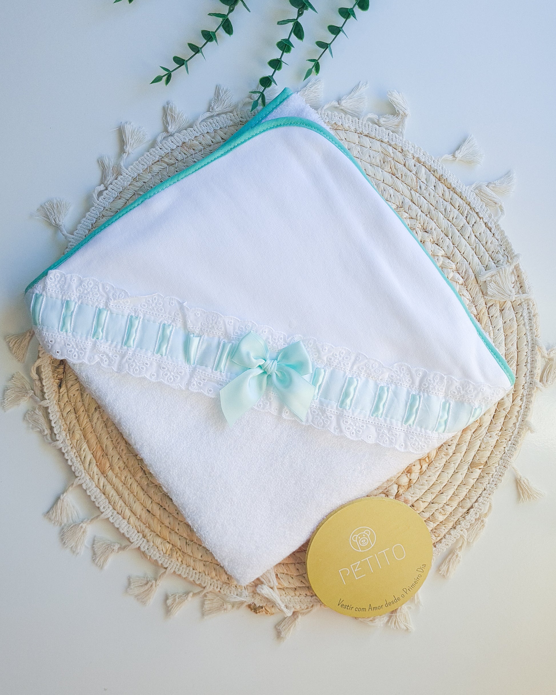 Toalha de banho com capuz, com bordado inglês e fita e laço de cetim.