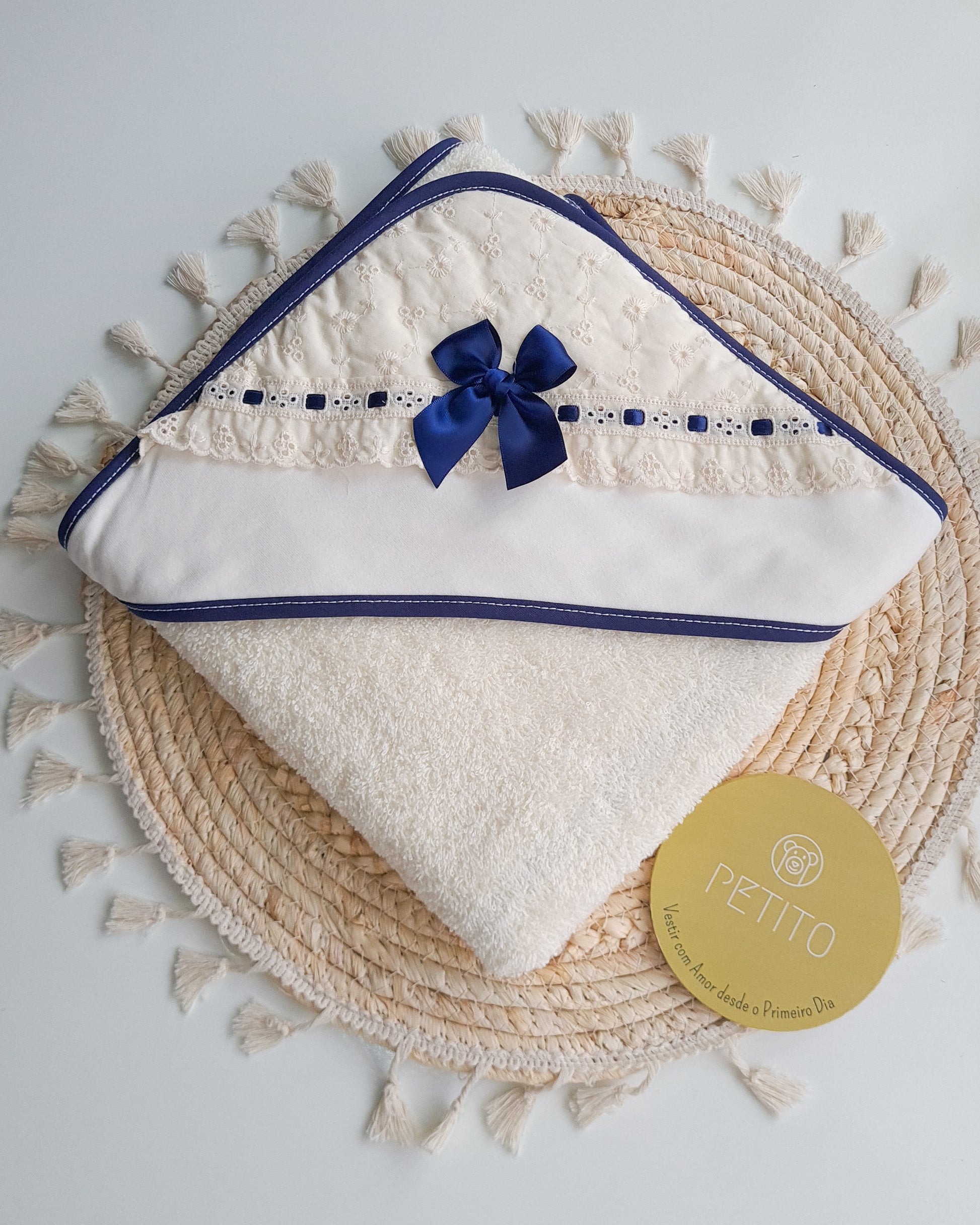 Toalha de banho com capuz, com bordado inglês e fita e laço de cetim em azul marinho.