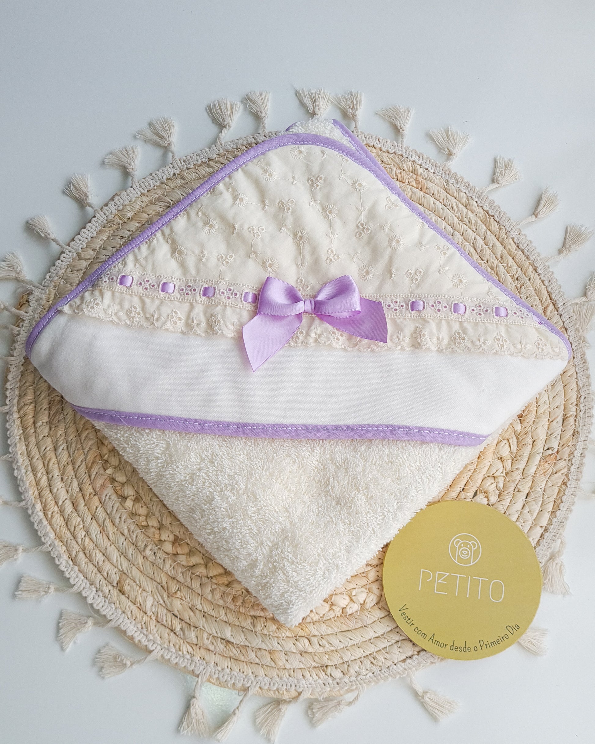 Toalha de banho com capuz, com bordado inglês e fita e laço de cetim.