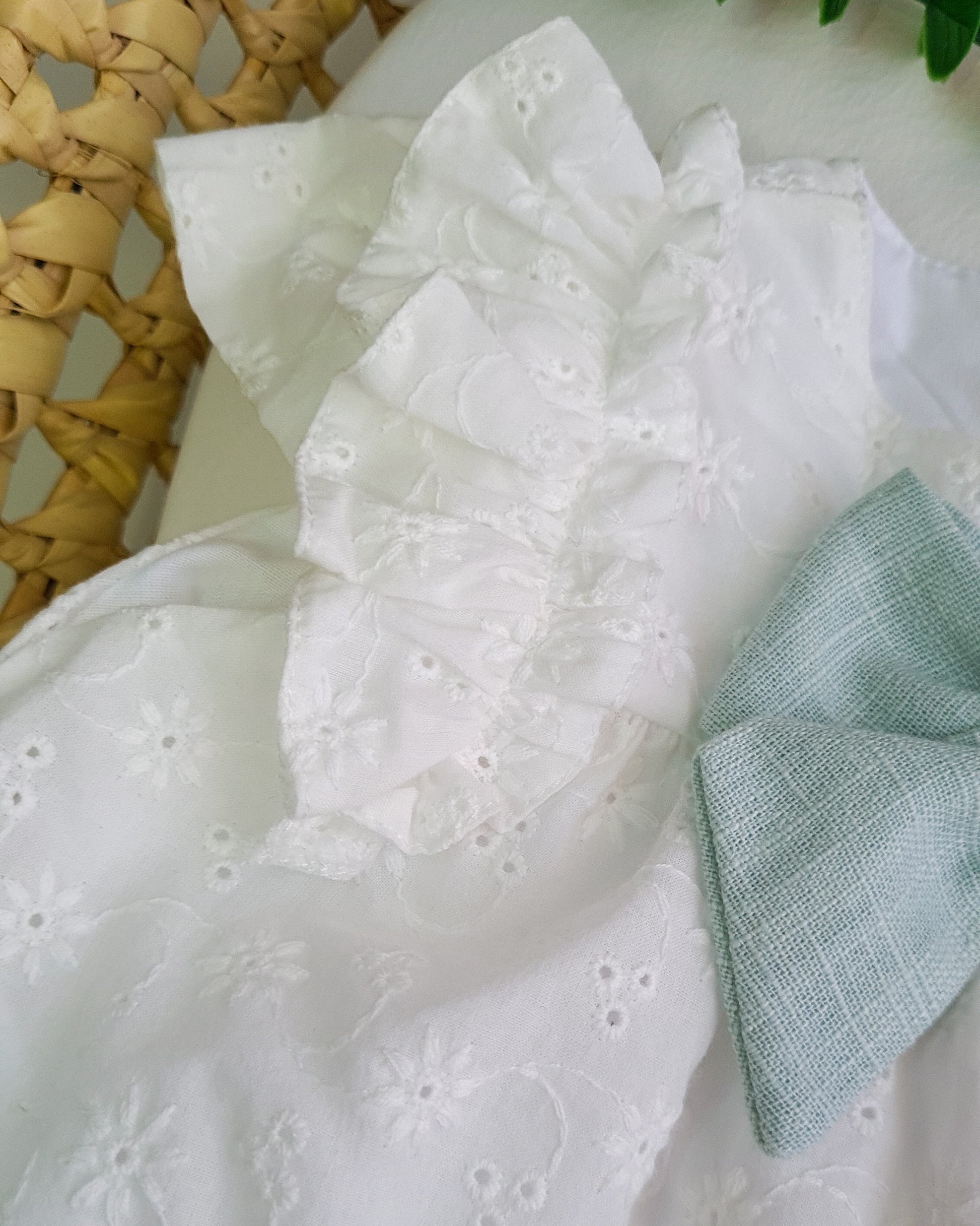 Vestido com bordado inglês, laço em linho e tapa-fraldas.
